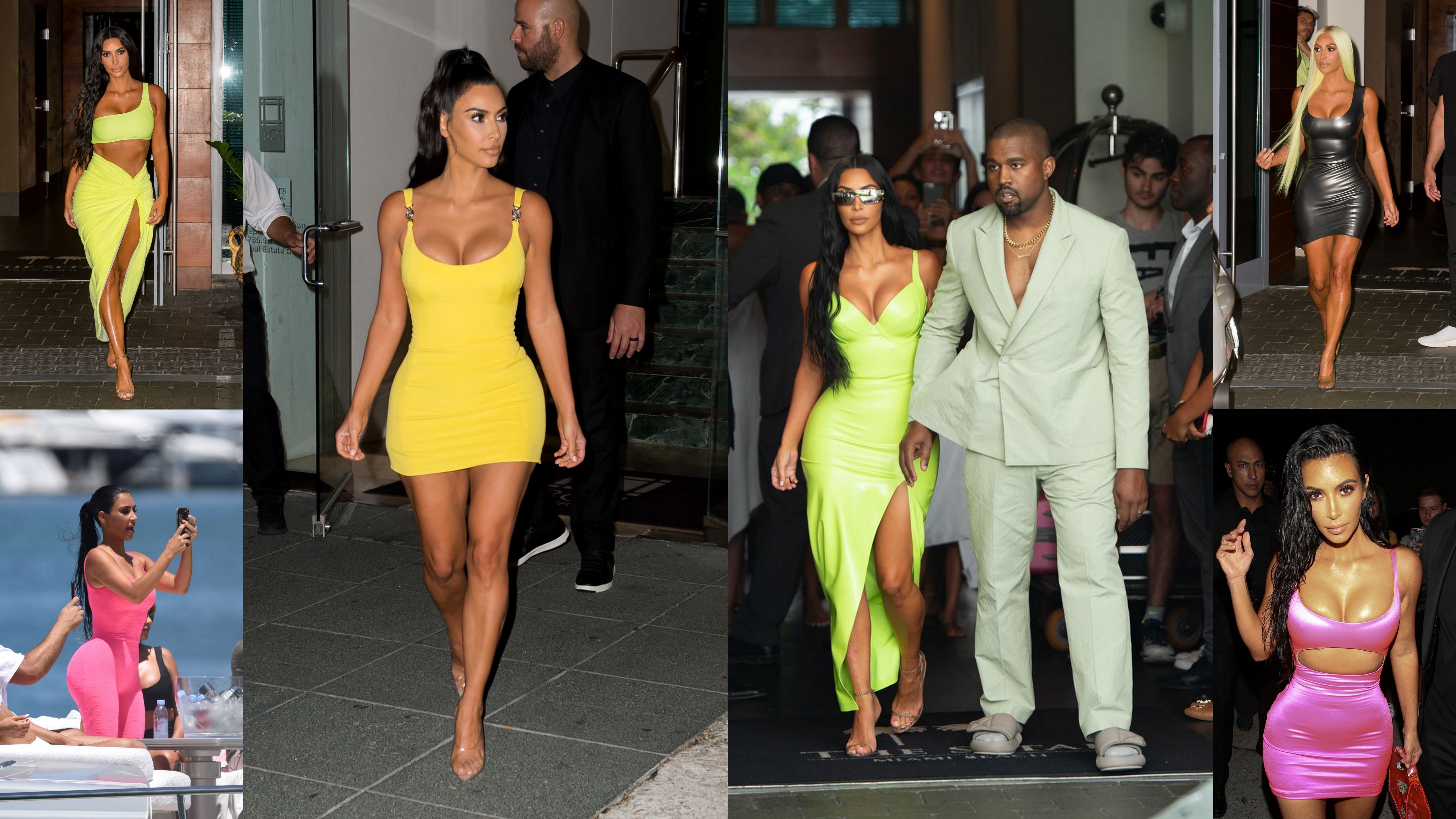 Abordând tema neon, Kim a apărut în această rochie mini din latex, imposibil de mers în ea, la care a adăugt o geantă sub formă de cartofi prăjiți cu strasuri.