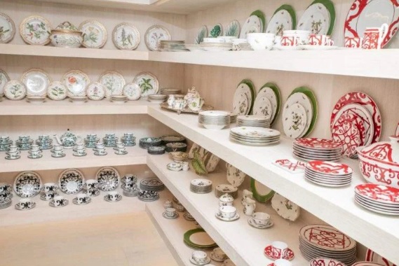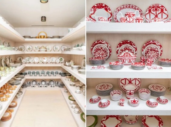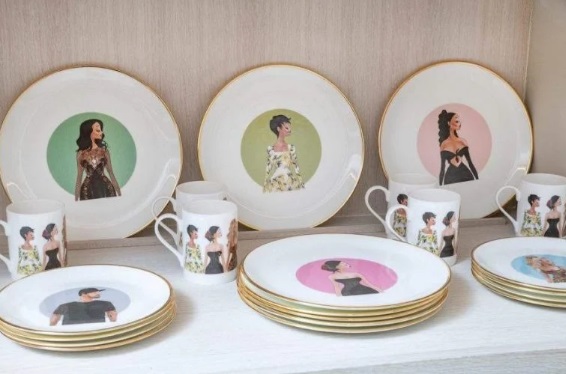 Printre numeroasele articole de masă Hermès și Gucci se numără câteva piese personalizate care ies în evidență cu portrete ale fiicelor ei celebre pictate pe ele.
