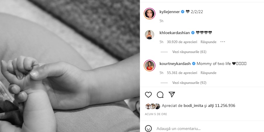 Fotografia alb-negru care arată ceea ce pare a fi fiica lor de 4 ani, Stormi, ținând mâna unui nou-născut, iar în descrierea ei apare un emoji cu inimă albastră și data 2/2/22.