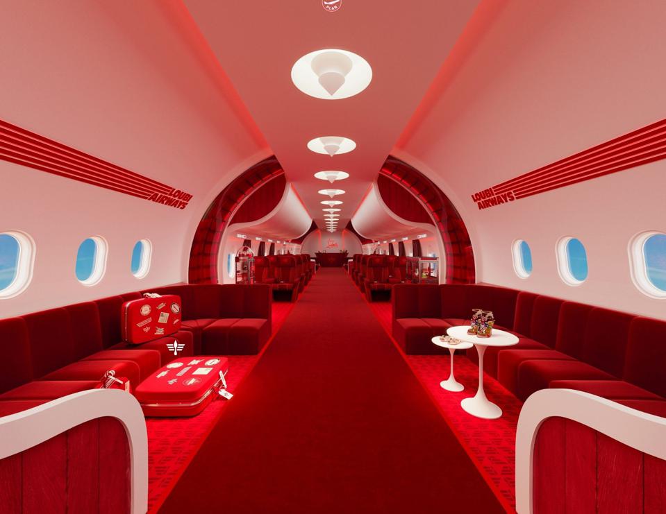 Terminalul JFK din New yYork a fost proiectat de Eero Saarinen, având un aspect futurist din anii 1960, epoca de aur a călătoriilor cu avionul. Odată ajunși în avion, puteți vedea detaliile roșii ale casei de la pardoseală la scaunele personalizate și sigla personalizată Loubi Airways. Niciun detaliu nu a trecut neobservat de la scannerul de securitate, la cardurile din spatele fiecărui scaun.