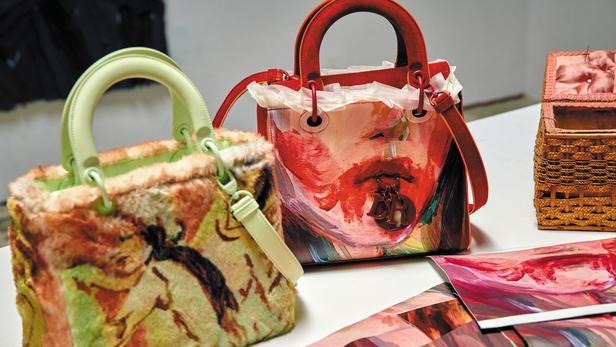Claire Tabouret oferă două propuneri pentru geanta Lady Dior. Una din blană artificială imprimată și piele fosforescentă (stânga), a doua din piele imprimată și catifea roșie, îmbunătățită cu organza albă plisată.