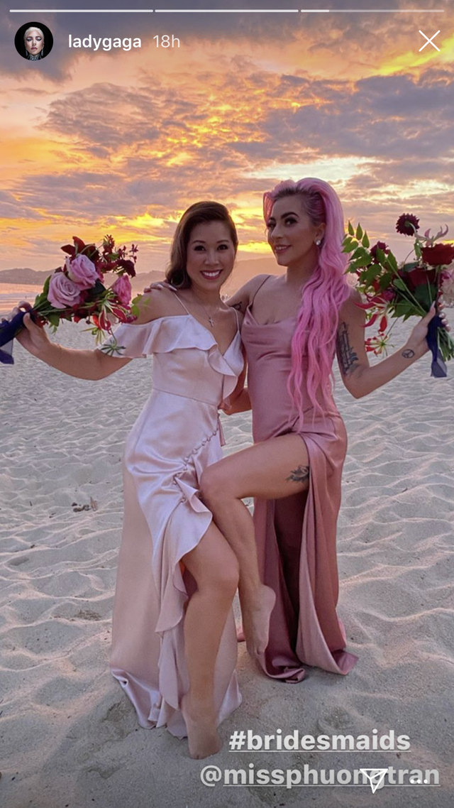 Lady Gaga a fost domnișoară de onoare weekendul trecut pentru nunta prietenilor apropiati Sarah Nicole Tanno si Tim Stewart. Ambii colaborează cu Gaga, Tanno este responsabilă cu machiajul cântăreței și Stewart este chitarist. Deci, cum s-a îmbrăcat Gaga pentru ocazie? Cât se poate de roz: cântăreața a purtat rochie roz asortată cu părul tot roz. Ea a postat două fotografii ale look-ului ei pe Instagram.