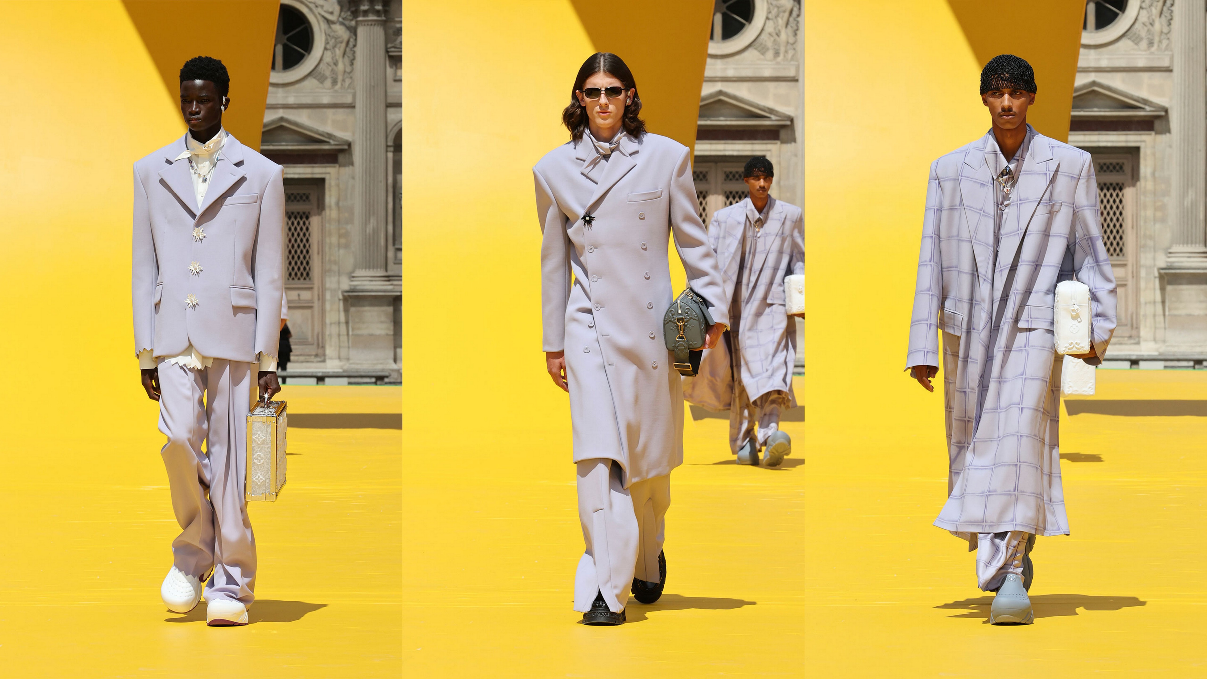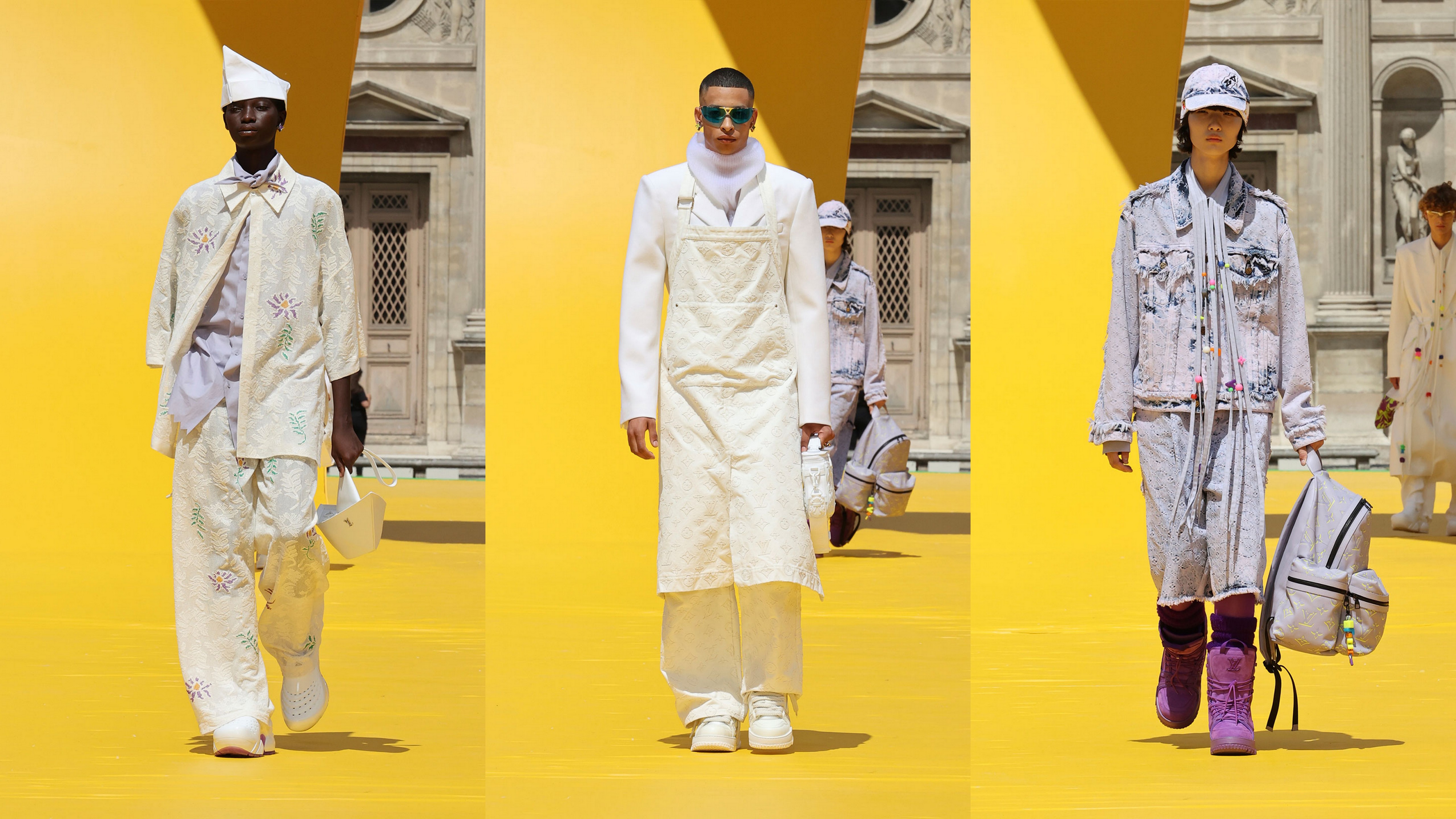 Prezentarea de modă a început cu o gamă de costume liliac cenușiu moi, accesorizate cu genți albe cu monograma LV, urmate de motive florale îndrăznețe care apar pe jachete, pantaloni, paltoane și multe altele. Aceeași nuanță a fost aplicată pieselor din denim, în timp ce detaliile colorate cu mărgele au evidențiat un număr complet alb. În altă parte, jachetele verzi neon au venit în forme deformate, însoțite de cizme la fel de izbitoare, marcate cu sigla LV.