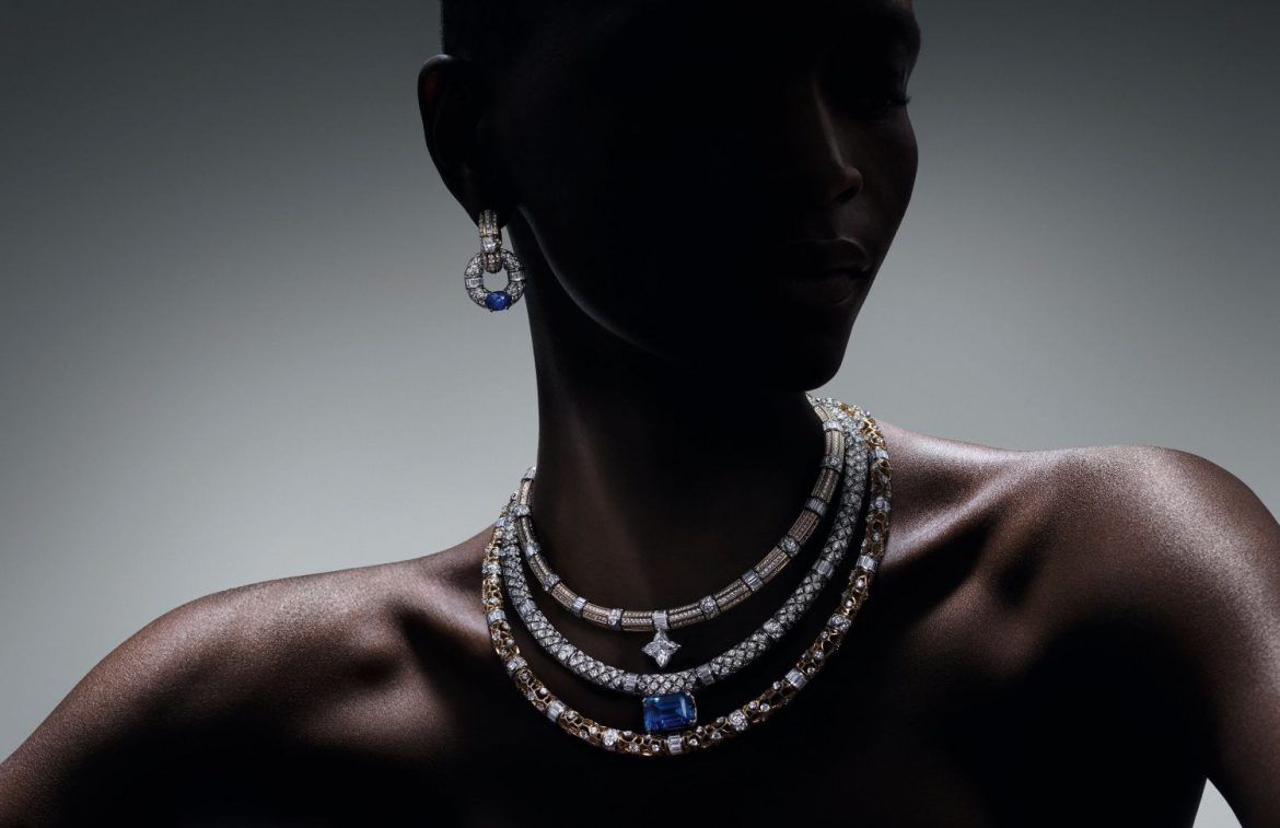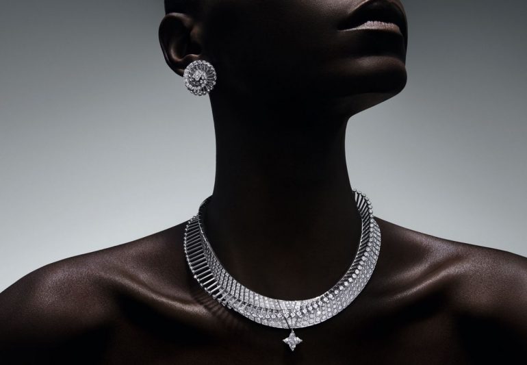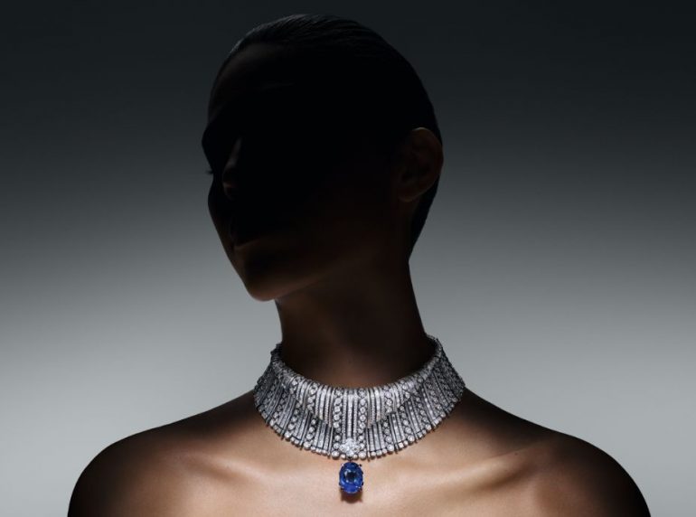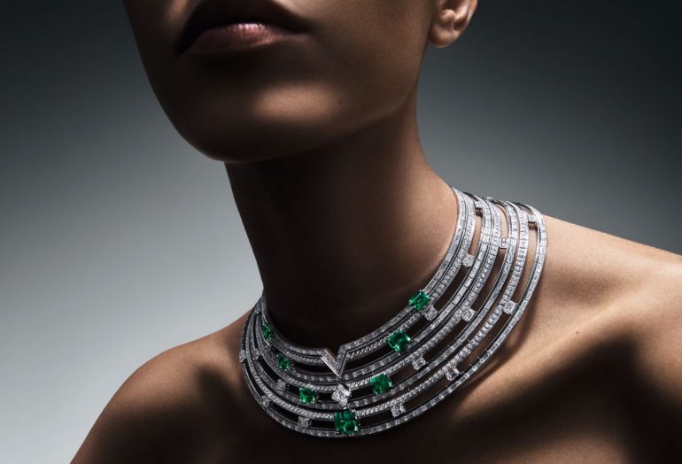 Un val de mirare este experimentat în spectacol, colier Wave cu guler înalt, care este totul îndrăzneț, frumos și albastru. Cel mai incredibil aspect este manifestarea creativă a formei V a semnăturii LV, realizată din benzi alternante mici și mari de pavaj și pietre de baghet. Designul culminează într-un diamant LV Monogram Flower de 6,19 carate care atârnă delicat peste un uluitor safir tăiat oval de 40,80 carate din Sri Lanka. Interesant este că piatra poate fi, de asemenea, desprinsă și purtată pe un lanț separat.