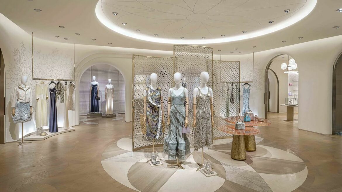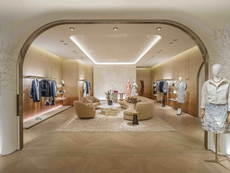 Încăperea fermecătoare este îmbunătățită prin adăugarea de fotolii franțuzești de epocă sau de canapeaua Pierre Augustin Rose personalizată în timp ce răsfoiți cea mai recentă colecție de prêt-à-porter a casei, conform Straitstimes.