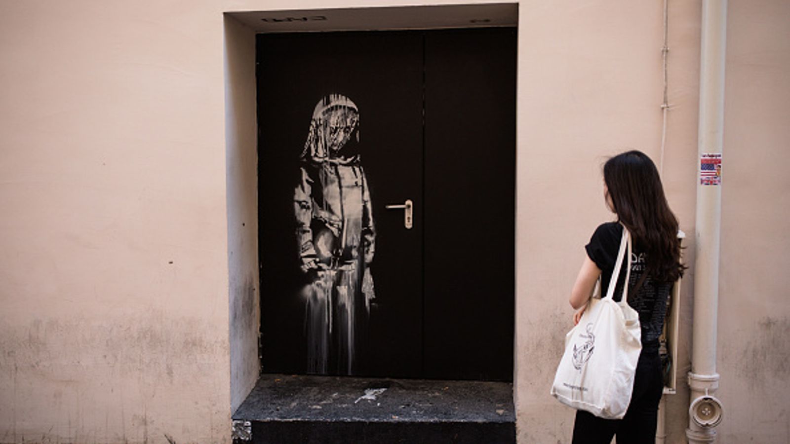 Stencilul mural, descris de administratorii sălii pariziene drept „un simbol al reculegerii”, este una dintre lucrările atribuite lui Banksy care au apărut în Paris în iunie 2018.