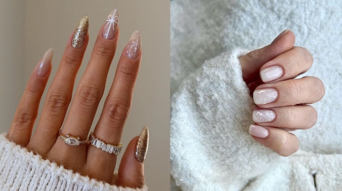 Manichiura de iarnă la modă în acest moment sunt simple și se remarcă printr-o gamă de nuanțe albicioase, sclipici și decorațiuni minimaliste, precum accente minuscule de lac strălucitor, particule aurii sau argintii.