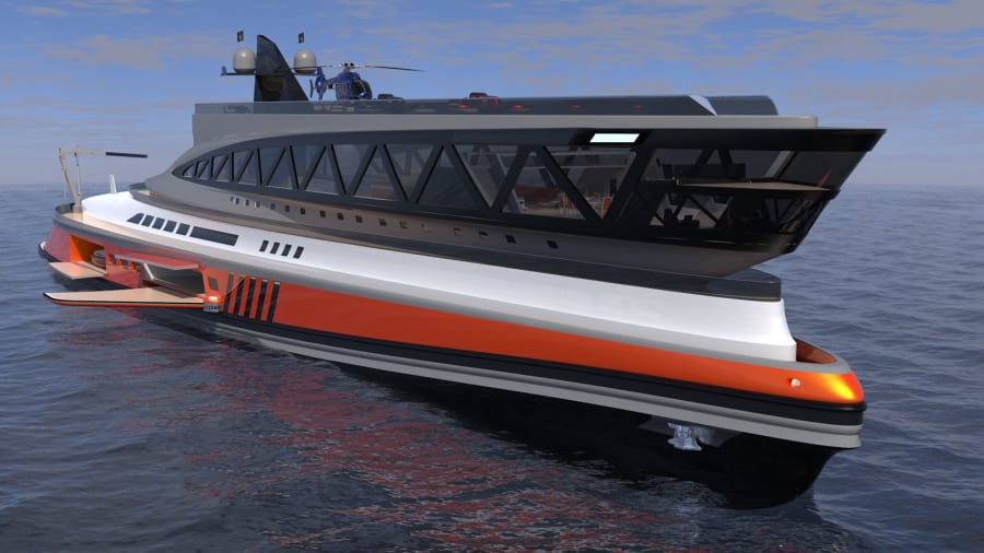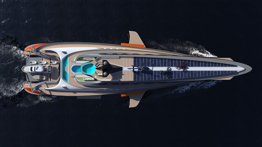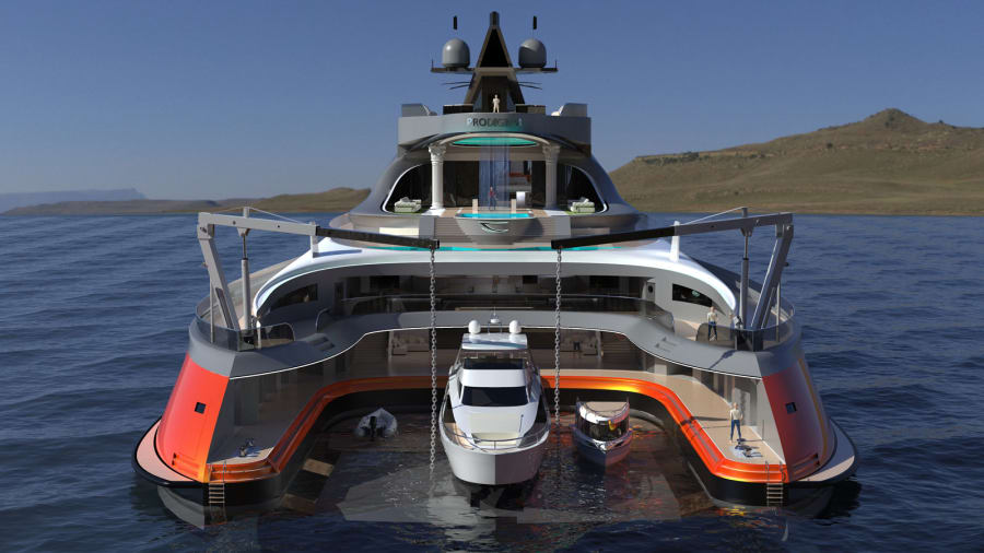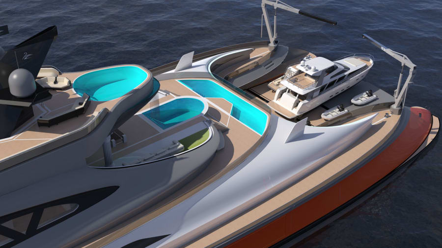 Conceptul de megayacht este echipat cu un port propriu, cu spațiu suficient pentru un al doilea iaht de până la 30 de metri, precum și trei piscine. Designul său exterior prezintă influențe romane antice, cu două coloane impunătoare care susțin structura superioară în mod grandios.