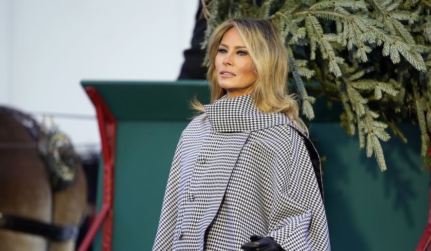 Melania nu putea pierde ocazia de a face încă o paradă a bunului gust, primind trăsura încarcadă cu bradul de Crăciun într-o haină superbă cu print alb şi negru, de la Balenciaga, completată cu cizme şi mănuşi negre.