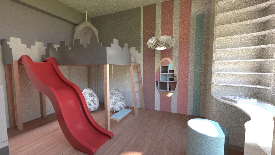 "Sunt două dormitoare: a lui Octav este cu tema preferată Fortnite dar și cu accesorii pentru mișcare și al Mariei este cu prințese jucăușe. Are propriul tobogan când vrea să se dea jos din pat.