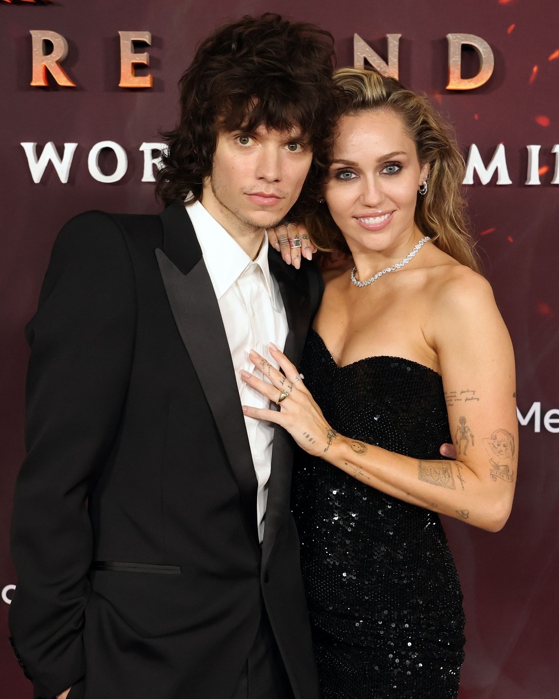 Pentru apariția de pe covorul roșu, Miley Cyrus a ales o rochie Gucci neagră, fără bretele, din paiete, cu trena amplă, în timp ce Maxx Morando a purtat un tuxedo clasic, complet negru.