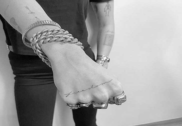 În weekend, cântăreața în vârstă de 27 de ani și-a făcut două tatuaje noi pentru a le alătura colecției de artă corporală pe fondul divorțului de fostul Liam Hemsworth. Primul cuvânt a fost dezvăluit sâmbătă și este vorba despre cuvântul „libertate” scris cu delicatețe pe mâna ei. Duminică s-a aflat că cel de-al doilea tatuaj pe care Cyrus îl alesese este de fapt un mesaj sentimental de la Yoko Ono. "Sunt mândră de tine, Yoko", apare textul caligrafiat de mână al lui Ono pe umărul stâng al lui Cyrus. Anul trecut, vedeta pop a cântat piesa lui Yoko Ono și „Happy Xmas (War is Over)” de John Lennon cu Mark Ronson și fiul cuplului renumit, Sean Ono Lennon.