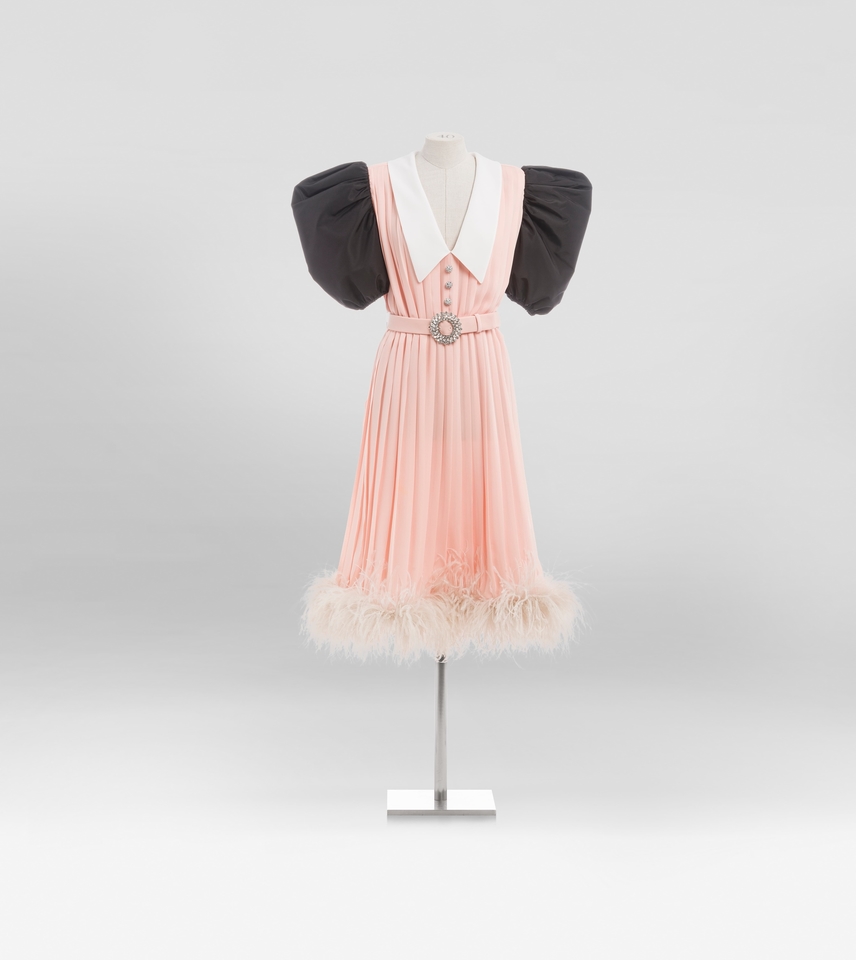 O rochie de zi creponată din anii '70, personalizată cu mâneci din mătase neagră, o centură bătută cu cristale, un guler apretat alb li o fustă cu margine din pene. Disponibilă la Miu Miu Londra.
