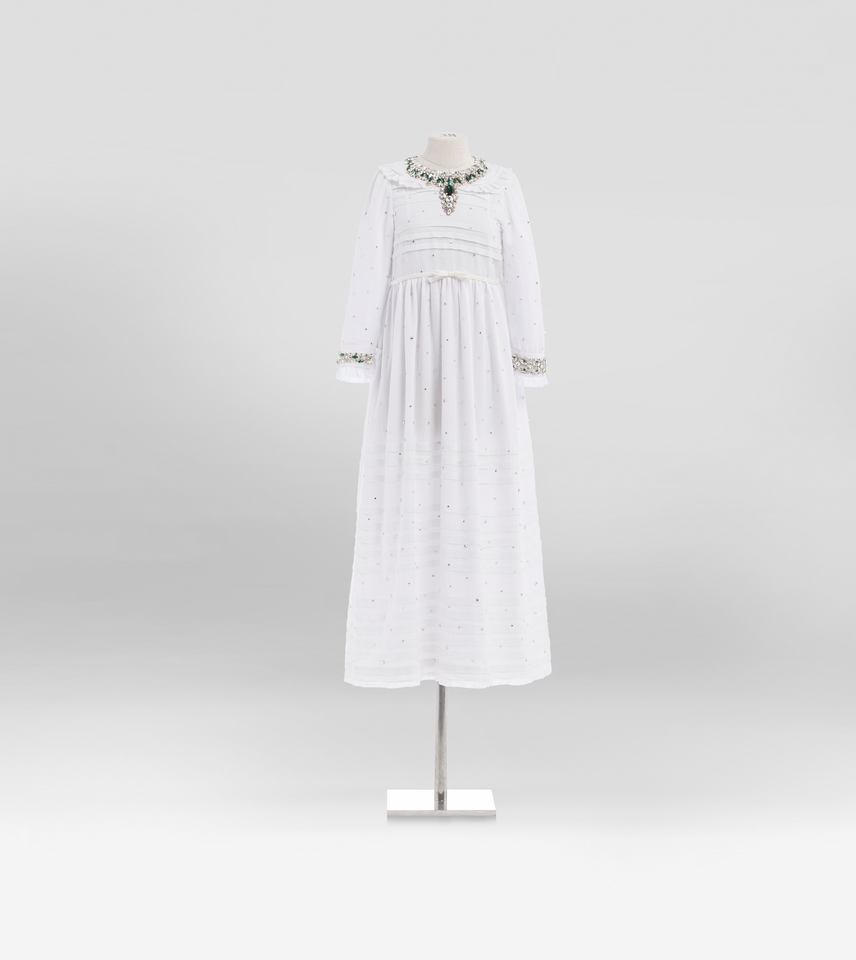 O rochie de ceai plisată, din bumbac alb, din anii '70, persoanlizată cu diamante pe guler și manșetă. Disponibilă la Miu Miu Moscova.