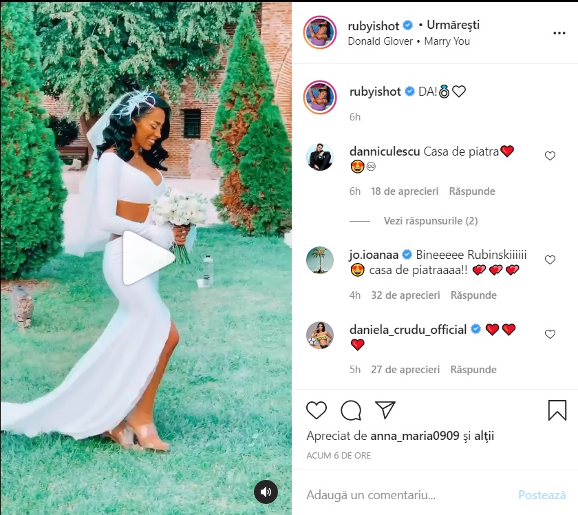 Deși el nu se vede în acest filmuleț publicat pe instagram, Ruby apare în rochie de mireasă, cu un buchet de flori în mână, alături de mesajul "DA". Aceste mici amănunte au stârnit luni foarță multă bucurie din partea fanilor, pe Instagram. Chiar și câteva vedete și prietene de-ale solsitei au felicitat-o pe cântăreața. Cu toate acestea noi am aflat, în exclusivitate, că solistă de fapt nu s-a căsătorit și că de fapt sunt imagini dintr-un videoclip pe care solistă l-a filmat la o viitoare melodie pe care o va lansa în viitorul apropiat. Pînă una altă, Ruby a lansat o nouă piesă și un alt videoclip la o melodie cu Jador, care se numește "Secrete de dormitor" și la care au filmat videoclip.