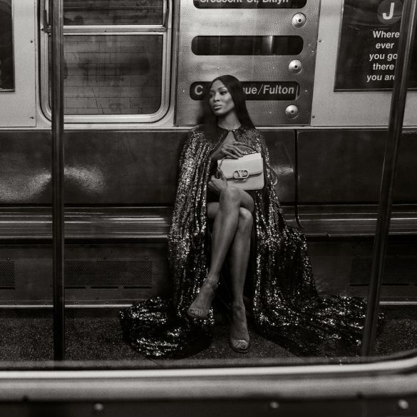 Naomi a pozat complet dezbrăcată, purtând doar o pereche de pantofi cu toc și diferite genți Valentino. Ședința foto a fost realizată înaintea pandemiei de coronavirus.