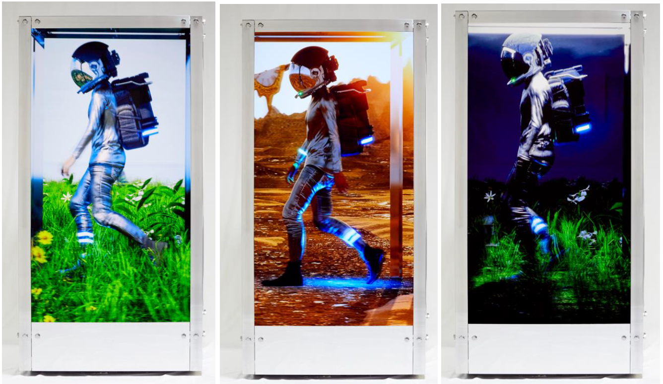 Este vorba de o sculptură video 3D de dimensiuni mari, iar artistul o numește „Primul portret al unui om născut în metavers”. Arată o persoană în haine de argint și cizme, cu rucsac şi cască - o combinaţie de astronaut și de motociclist - care se deplasează cu un scop precis într-un peisaj în schimbare. A fost achiziționat săptămâna această de Ryan Zurrer, un investitor elveţian.