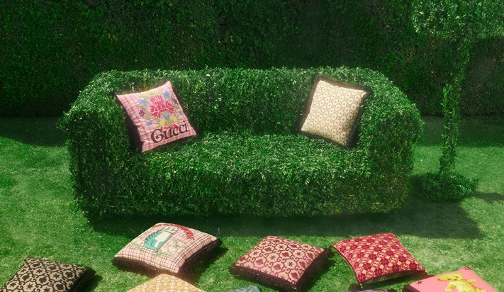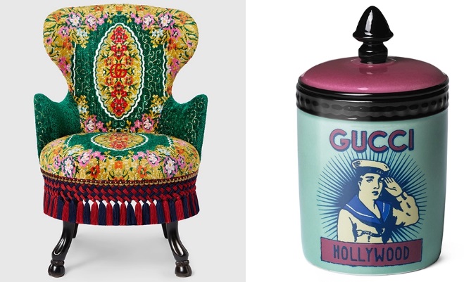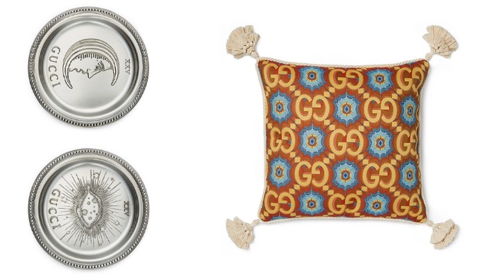 Dar în colecție există mai mult decât bijuterii și produse pentru masă. Tapetul din ofertă prezintă imprimeuri florale și geometrice cu design retro. Trei dintre motivele florale au fost redate într-o textură de in pentru un sentiment rafinat, tactil. Iar pernele aduc o energie jucăușă colecției, mulțumită în parte redărilor colorate ale modelelor sale populare cu monogramă GG.
