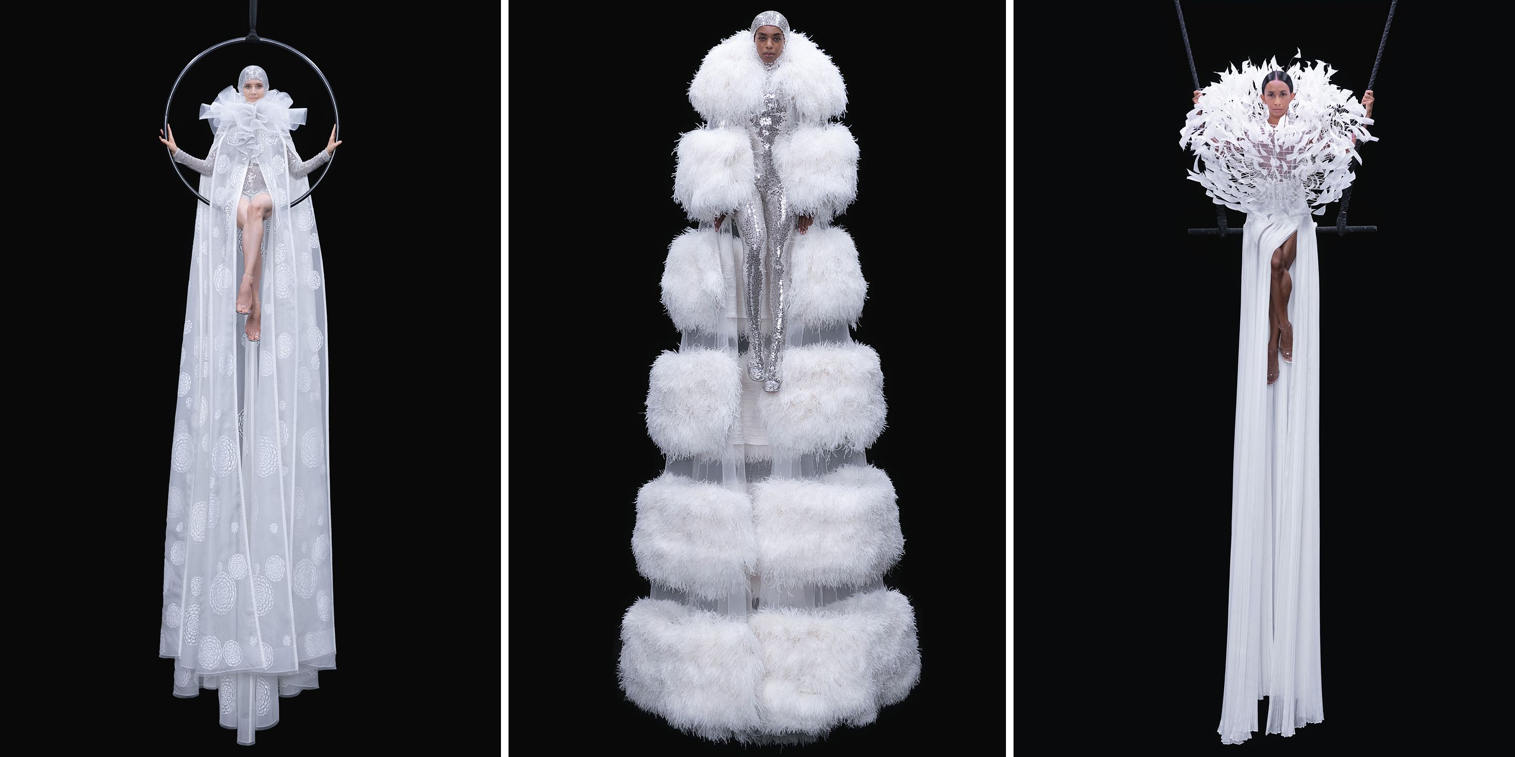 Modelele au fost fie cocoțate delicat pe leagăne suspendate de tavan, fie instalate pe platforme ascunse de albul rochiilor pe un fundal negru.