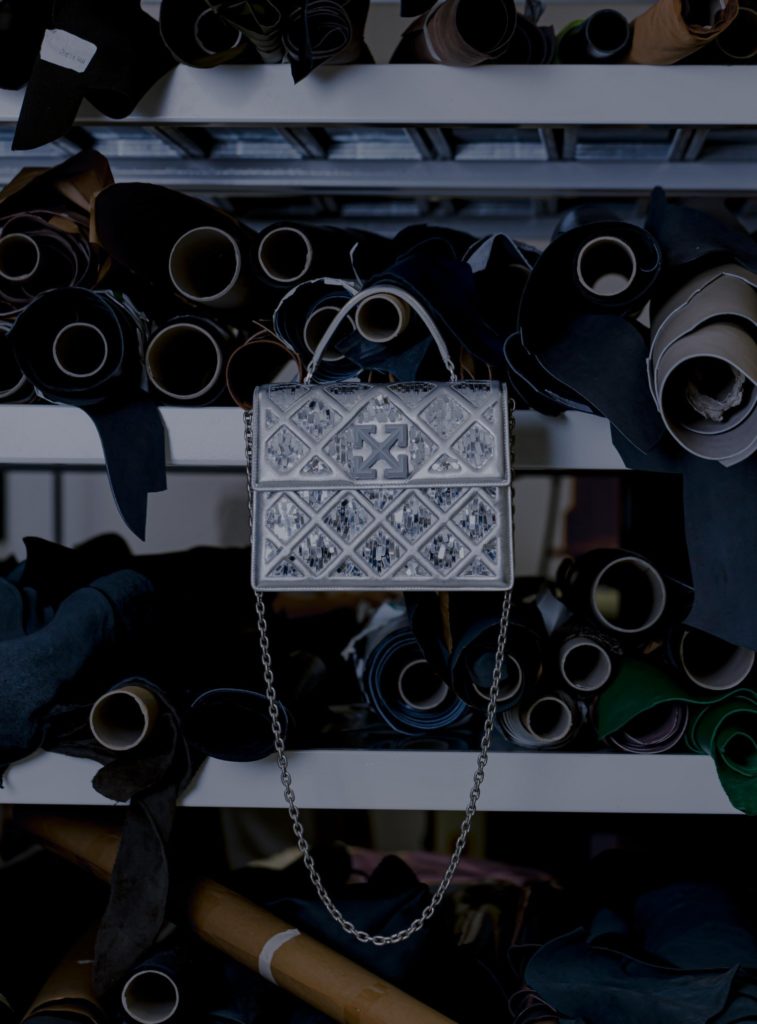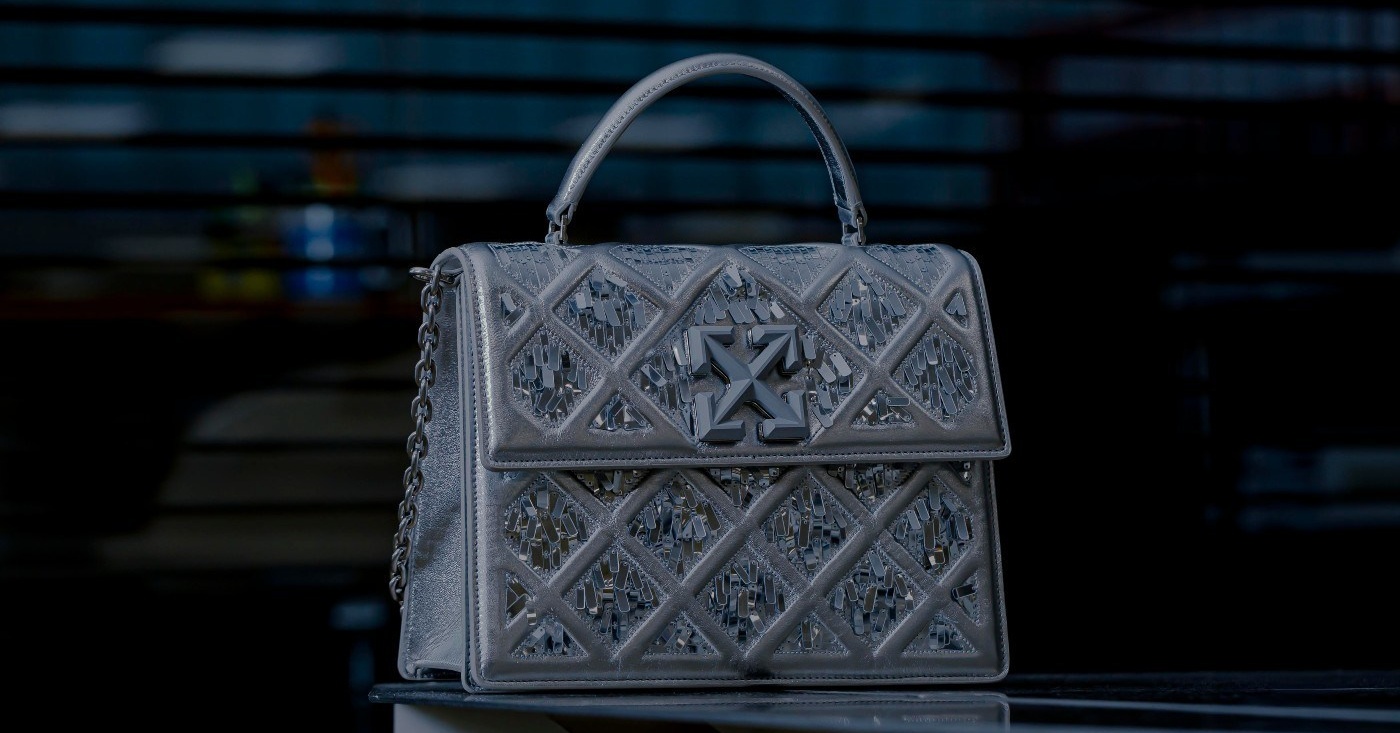 Geanta de mână 2.8 Jitney, inspirată de Muzeul Luvru, este fabricată din piele italiană de culoare argintie, laminată, pe care Abloh a reliefat-o special pentru a semăna cu structura metalică a Piramidei. Pentru un produs absolut spectaculos, designerul a acoperit și geanta în paiete argintii, făcându-l să sclipească.