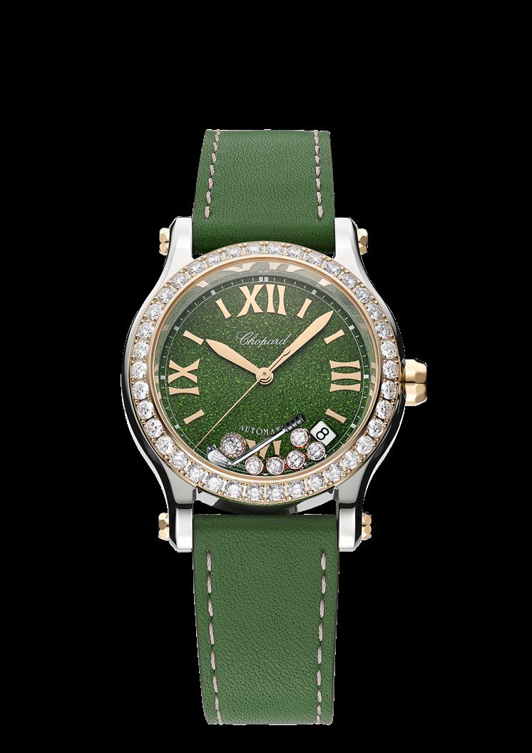 Botezat Happy Sport Golf Edition, ceasul vine cu o ramă încrustată cu cinci diamante între două cristale de safir. Dispune de o curea de piele de vițel verde cu un club de golf mobil și o minge care adaugă un element special prezentării.