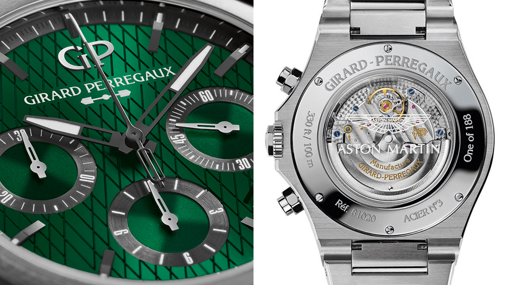 Modelul hașurat în linii fine negre de pe cadran este inspirat de scaunele matlasate găsite în mașinile sport de înaltă performanță ale mărcii britanice. Singurul logo de pe cadran este cel al ceasornicarului, Girard-Perregaux. Numele și logo-ul Aston Martin apar pe spatele carcasei, fiind gravate în spatele geamului de safir.