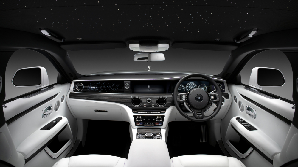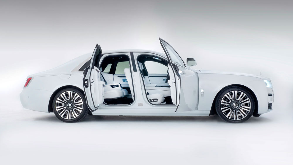Ușile care se deschid invers au devenit un alt element reprezentativ pentru Rolls-Royce – la noul Ghost, ele pot fi închise și deschise electric, apăsând un buton. Motorul este, de asemenea, un simbol al potenței tehnologice a casei britanice: capacitate cilindrică de 6,75 litri, 12 cilindri în V, două turbine, 571 CP și un cuplu de 850 Nm. Tracțiunea este integrală, la fel și direcția – toate cele patru roți virează.
