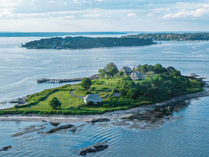 Este refugiul ideal pe timp de pandemie, o descriu cei care au scos-o la închiriat. Insula de 12 acri din largul coastei Portland, Maine, are o vedere panoramică asupra golfului Casco.