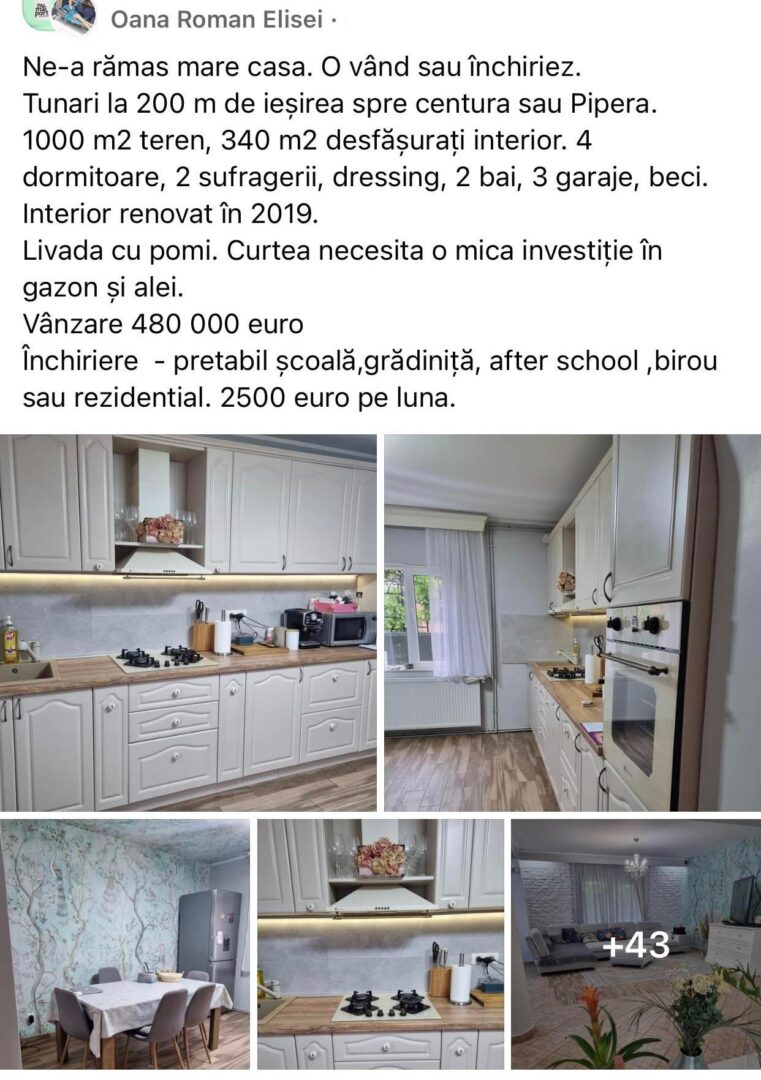 „Ne-a rămas mare casa. O vând sau închiriez. Tunari la 200 m de ieșirea spre centură sau Pipera. 1000 m2 teren, 340 m2 desfășurați interior. 4 dormitoare, 2 sufragerii, dressing, 2 bai, 3 garaje, beci. Interior renovat în 2019. Livada cu pomi. Curtea necesită o mică investiție în gazon și alei. Vânzare 480 000 euro, închiriere – pretabil scoală, grădiniță, after school , birou sau rezidențial 2.500 euro pe lună”, este anunțul de vânzare publicat de Oana Roman pe contul ei de Facebook.