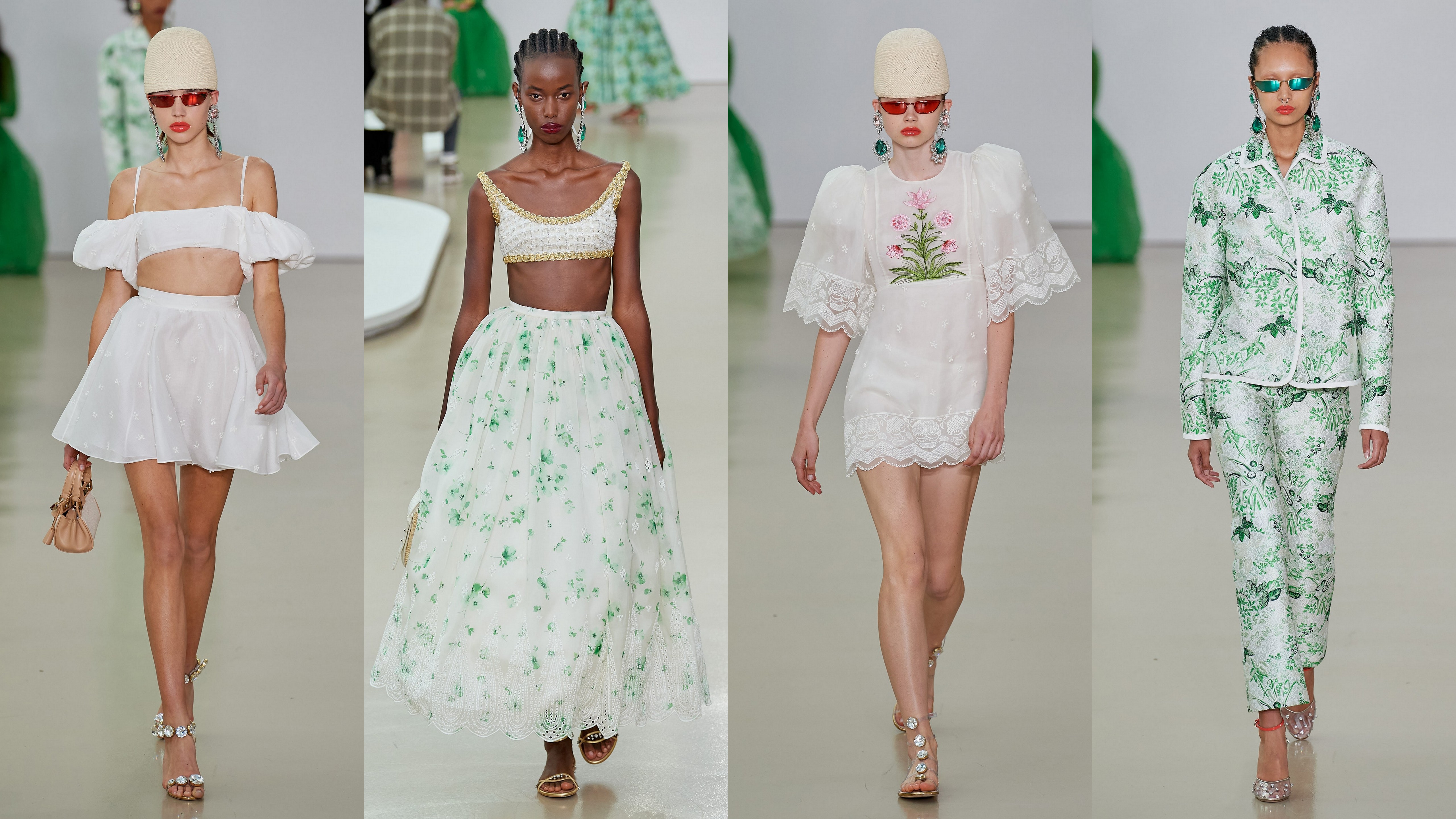 „Viața este frumoasă - să ne bucurăm de ea”, a spus designerul. „Frumusețea a fost evadarea mea în timpul blocării. A fost o fereastră pentru sufletul meu.” Acest spectacol luxuriant, cu culorile pastelate de milkshake și florile le-au oferit oaspeților ocazia să exploreze universul lui Giambattista Valli. Creațiile lui sunt inconfundabile, rochii scurte și fuste cu broderie elvețiană cu puncte și volane înfloritoare în partea din față, modele pe talie Empire mărginite în aur și piese de dantelă albă.
