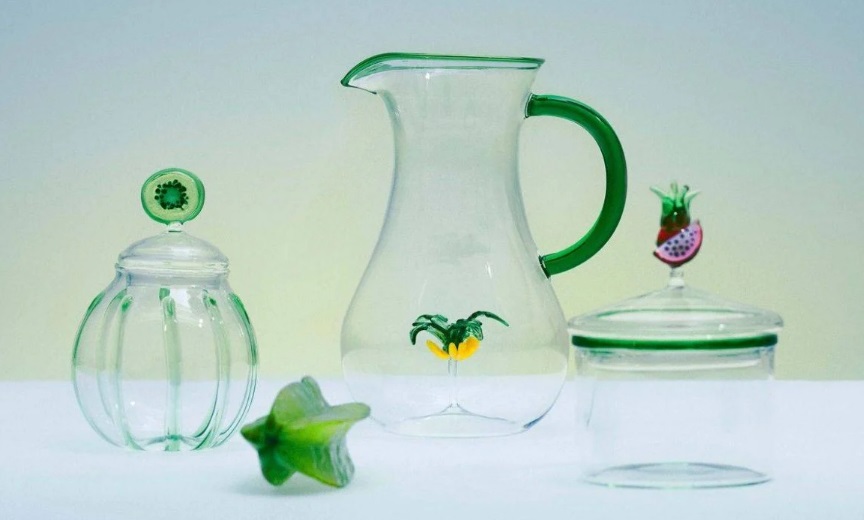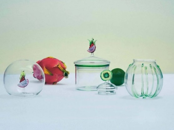 Prevăzute cu banane vibrante, kiwi, ananas, fructul pasiunii, articolele sunt realizate complex din sticlă fină suflată manual din Italia. Unele dintre cele mai atrăgătoare oferte includ un glob decorativ din sticlă suflat manual cu un încântător fruct al dragonului din sticlă în miniatură, un borcan transparent de gem acoperit cu o felie minusculă de kiwi și un set de șerveturi țesute din rafie.