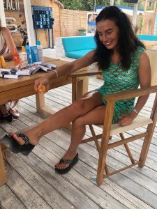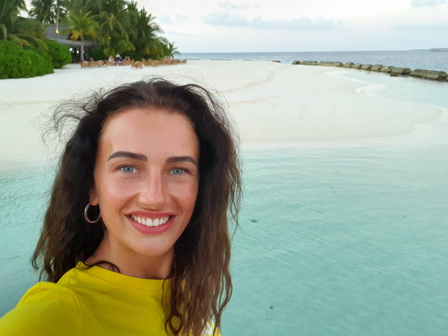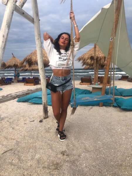 Tânăra este prima oară pe o plajă la noi, la ShutUp Beach din Mamaia la mare deși a mai fost plecată în Maldive, în vacanță, acolo unde a prins-o pandemia.