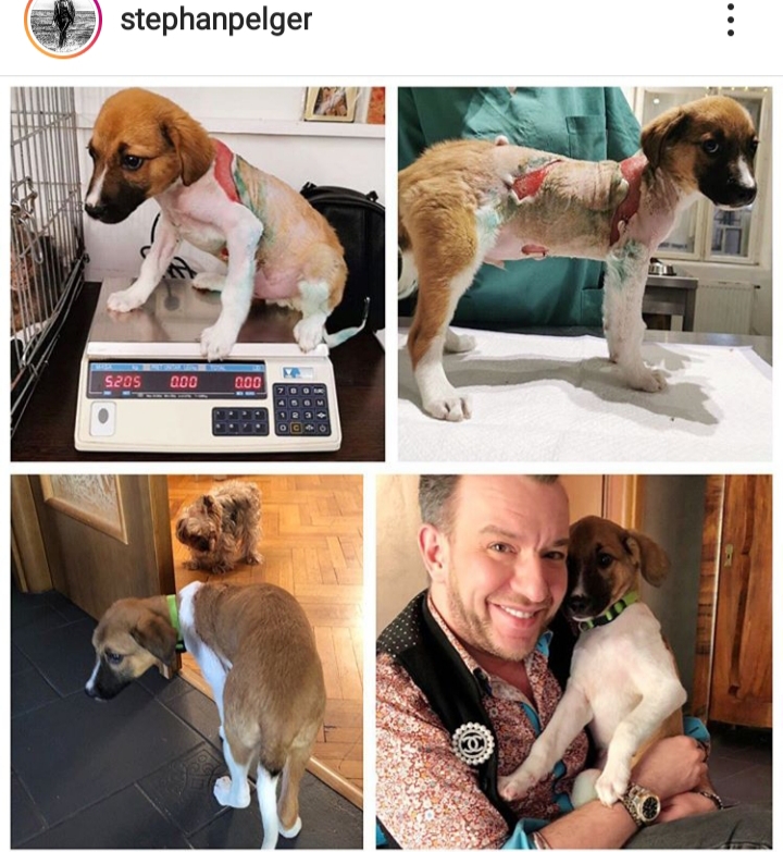 "El este Pepsi ❤️noul membru al familiei Pelger! Astăzi l-am cunoscut și m-am îndrăgostit de el în prima secundă!!! ❤️ Pepsi a trecut la numai cele 3 luni ale sale prin iad! Detaliile sunt crunte și revoltătoare, pozele vorbesc de la sine!!! Pe Pepsi l-am găsit văzând un post făcut de @noemimeilman despre asociația @kolakariola care se ocupă de plasarea a sute de animale abandonate și @cityvet la doamna doctor Aurora și Betty unde Pepsi este tratat momentan și este aproape sănătos, dar încă un pic speriat!