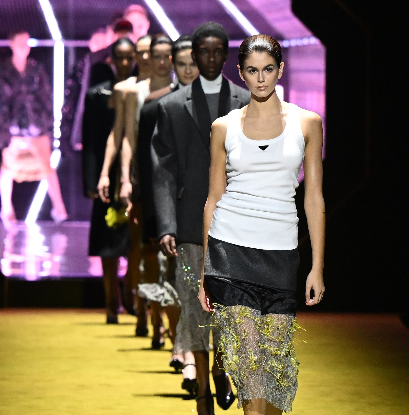 Deschis de Kaia Gerber și închis de Hunter Schafer, spectacolul de modă al casei Prada toamnă-iarnă 2022-2023 a reunit o distribuție stelară. Și am văzut o tendință specifică anilor 2000: un maiou alb cu logo-ul Prada.