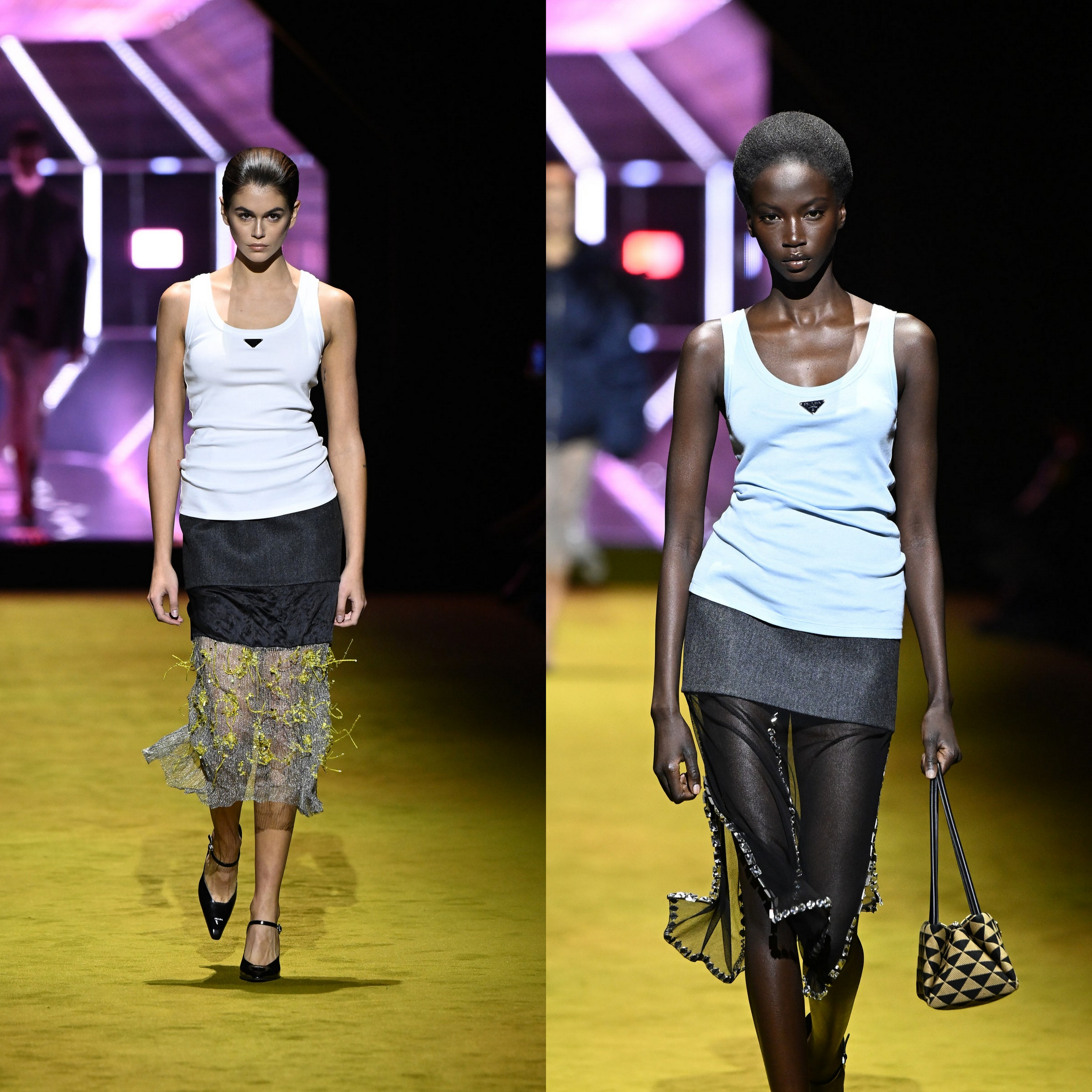 Din dorința de a crea o garderobă care să depășească convențiile, Prada își imaginează o nouă siluetă semnătură, în care caracteristicile îmbrăcămintei sport se combină cu rafinamentul unei fuste cu volume și materiale eterogene. Pentru seară, maioul își recapată glamourul. Și are succes.