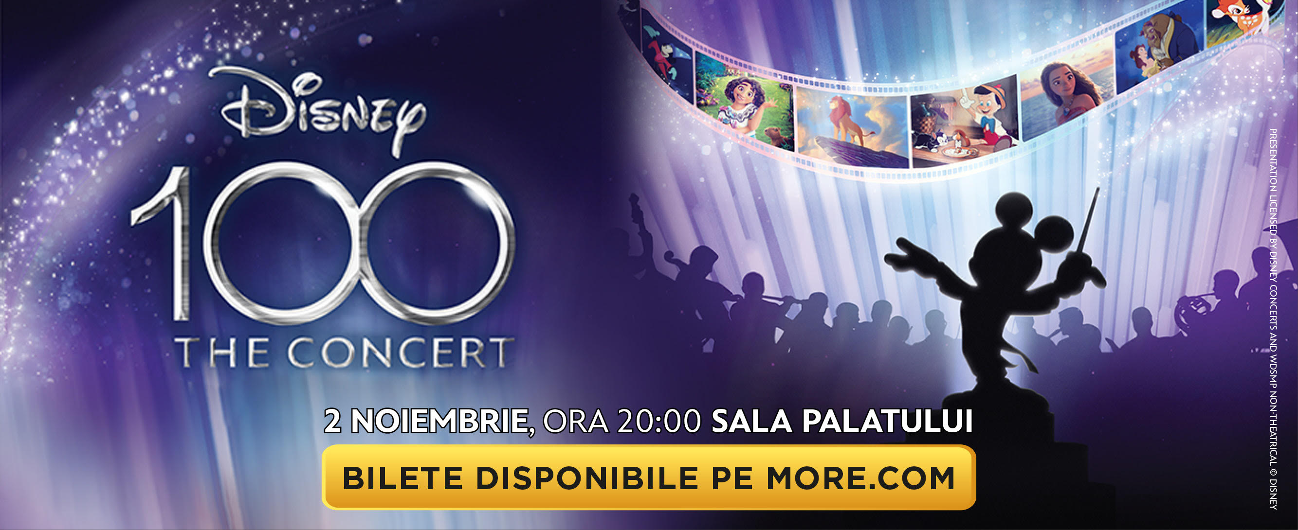 Cele mai cunoscute teme sonore din producţiile Disney se vor auzi live, pe 2 noiembrie în Bucureşti într-un spectacol în premieră ce aduce mult iubitele melodii şi personaje Disney, chiar pe scena Sălii Palatului. Playlist-ul concertului „DISNEY 100” va însuma cele mai îndrăgite piese din ”Frumoasa și Bestia”, ”Frozen”, ”The Lion King”, ”Star Wars” sau ”Marvel” în interpretarea unor solişti foarte apreciaţi printre care se vor numără: Ben Forster, Adrian Hansel, Nadia Boule, Alina Eremia, Alina Sorescu, Vlad Miriță, Ana Cebotari şi Lucian Ghimiş. Evenimentul va fi întregit de un show multimedia şi de proiecţii video din celebrele filme lansate în decursul celor 100 de ani de istorie Disney.