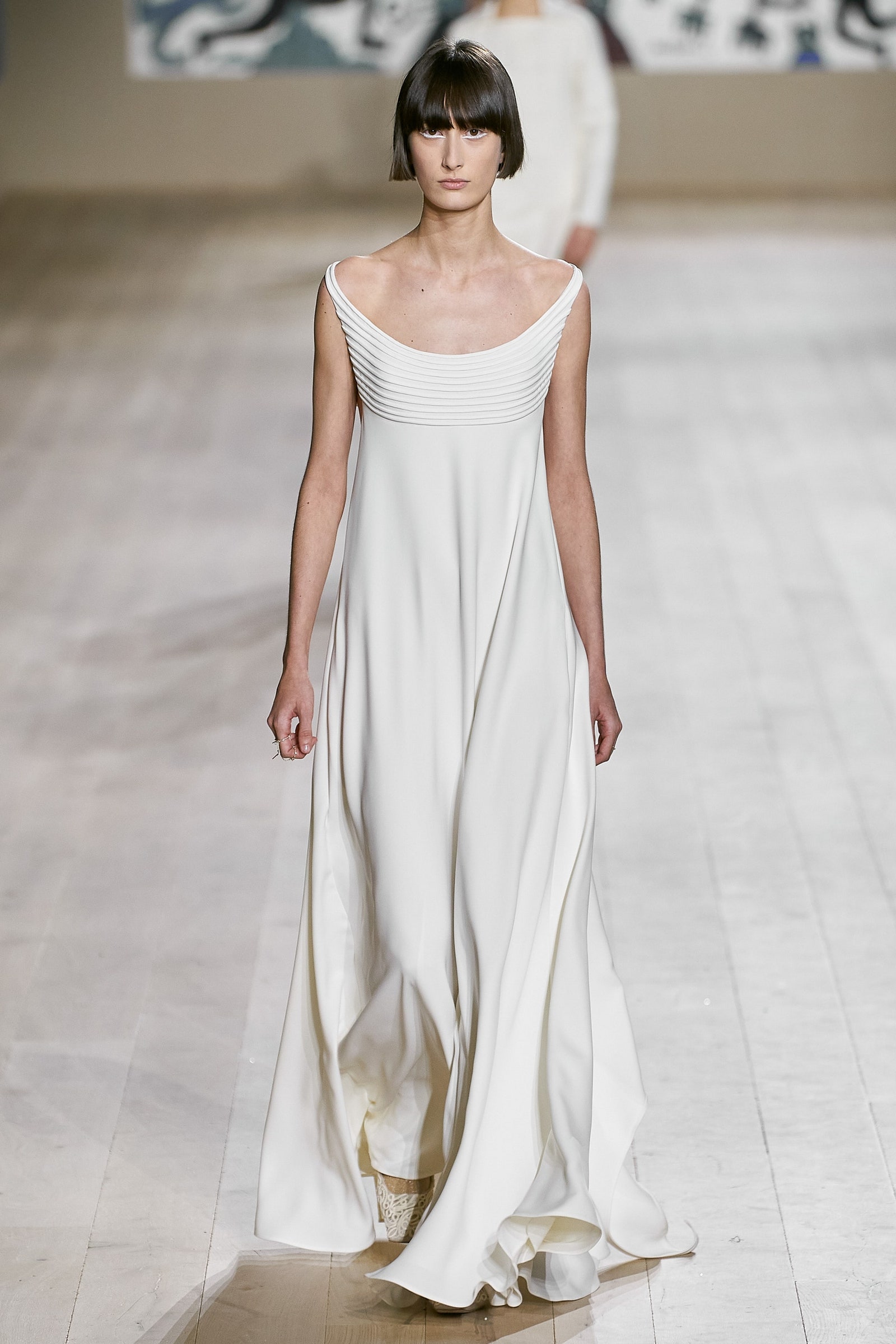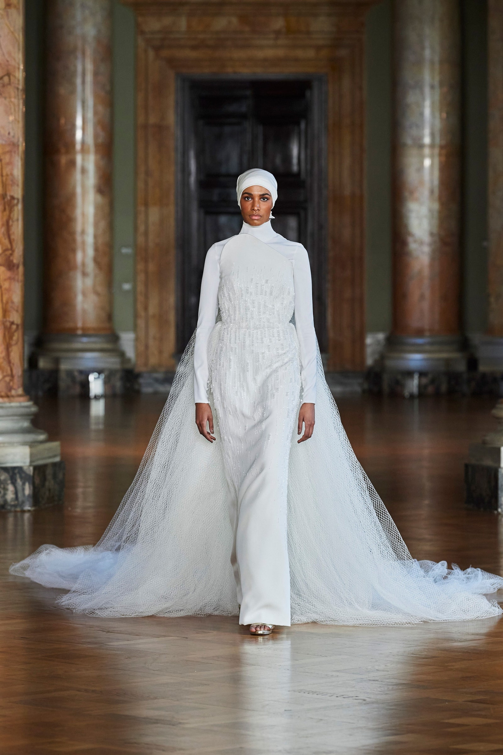 Gâtul înalt și mânecile lungi ale acestei rochii tub sunt contrabalansate de o trenă impunătoare.