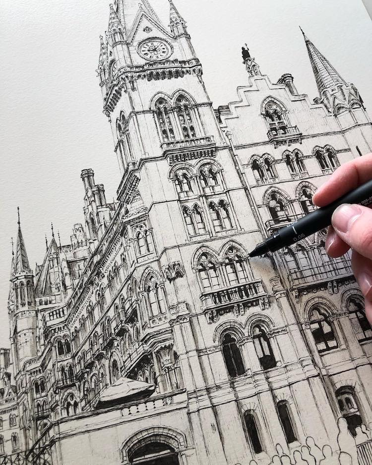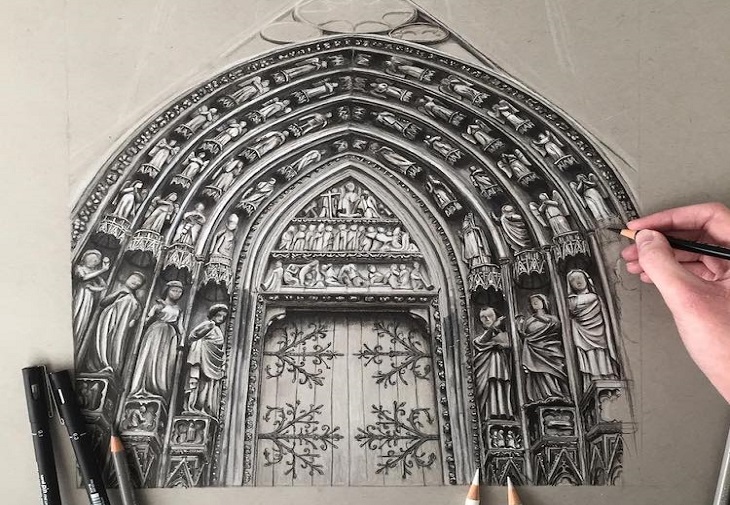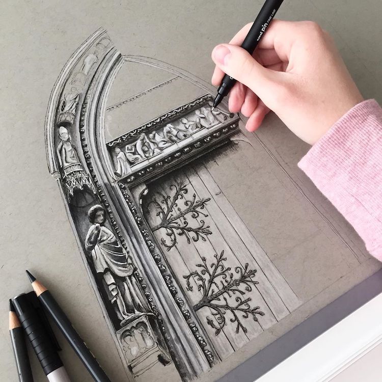 De la ușa arcuită a Catedralei din Strasbourg până la faimoasele Notre-Dame, Atkey surprinde frumusețea unora dintre cele mai emblematice clădiri ale Europei. Mâna tinerei artiste autodidacte! desenează fiecare detaliu ornat cu o precizie incredibilă și proporție perfectă. Atkey redă fiecare desen folosind o combinație de pix și creion, dar își păstrează paleta monocromă. Nuanțarea și evidențiarea inteligentă fac ca anumite părți ale desenului să apară tridimensional, aproape ca și cum ai putea atinge și atinge suprafețele pietroase ale clădirilor.
