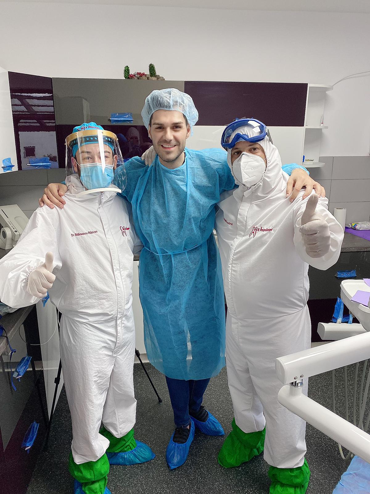 mai m-am dus la clinica lor de la Sibiu, căci acolo m-a prins izolarea. Însă când am ajuns la prietenii mei Fleică Andrei și Răzvan Stănescu nu mi-a venit să cred ce am găsit acololo, câtă precauție, precum în filmele SF, cu costumații speciale, cu bonete, botoși în picioare, condiții ca în serialul "Dosarele X". Eu dar și fiecare pacient primește de la bun început un set de mănuși de protecție, mască,