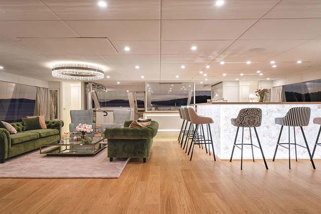 Concepută pentru călătoriile transatlantice, nava are o suprafață metalică uimitoare de culoare gri închis și o suprastructură aurie spre roz. În interior se află un amestec de furnir natural de stejar, cuarț roz, accente de alamă și dulapuri personalizate, cu cazare în cinci cabine mari cu baie privată și până la 10 oaspeți. Există și trei cabine pentru echipaj.