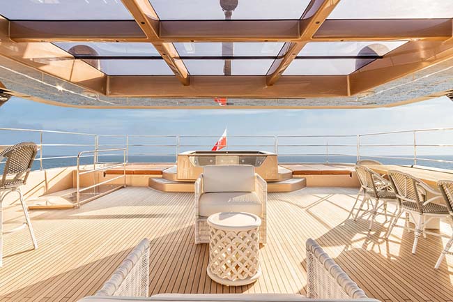 Cu spații uriașe de locuit interioare și exterioare, șantierul naval oferă un nivel ridicat de personalizare, pentru a răspunde nevoilor și dorințelor viitorilor proprietari. Conceput să ofere o lumină maximă ocupanților săi, nava dispune de geamuri panoramice de mari dimensiuni care permit ca salonul să fie inundat de lumină, acesta din urmă putând fuziona cu cockpitul de la pupa pentru a crea un fel de lounge semi-deschis.