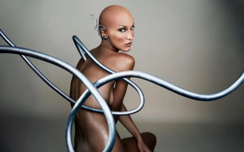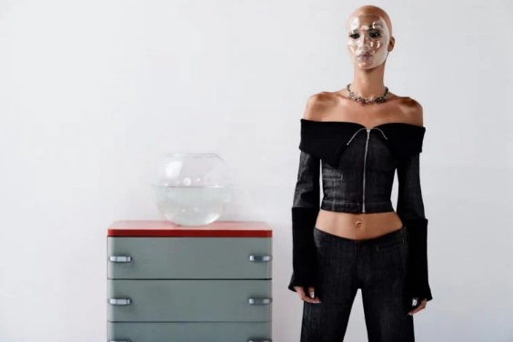 Hadid arăta ca ea însăși în alte imagini, purtand cizmele Kiki ale lui Marc Jacobs, o fustă de blugi și un top roz cu șuvițe lungi și fluide. Campania futuristă a luat o turnură asumată când modelul uluitor a pozat lângă geamănul ei cibernetic.