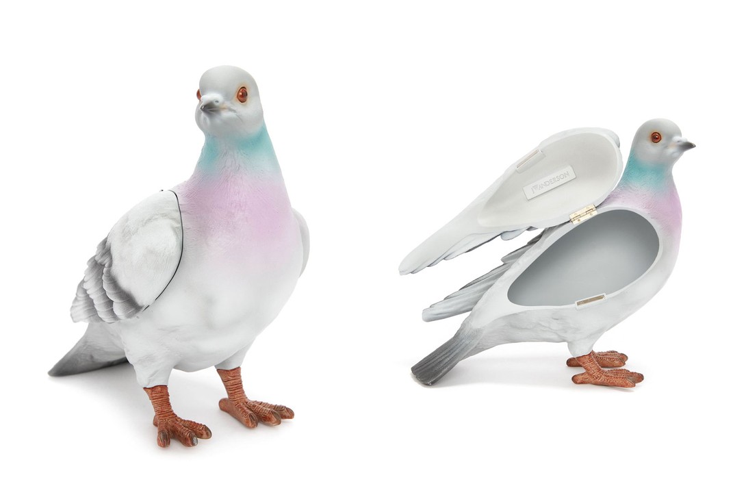 Acest clutch în formă de porumbel a fost dezvăluit pentru prima dată pe pista FW22 a mărcii JW Anderson, alături de alte modele suprarealiste, cum ar fi rochii cu tiv cu sârmă și topuri decupate realizate dintr-o grămadă de brățări de cauciuc legate una de alta. Geanta imprimată 3D vine cu o deschidere pe partea laterală sub aripa porumbelului și este completată cu marca JW Anderson pe interior. În timp ce această poșetă evident nu este făcută pentru a-ți purta lucrurile esențiale, cu siguranță este o piesă declarativă.