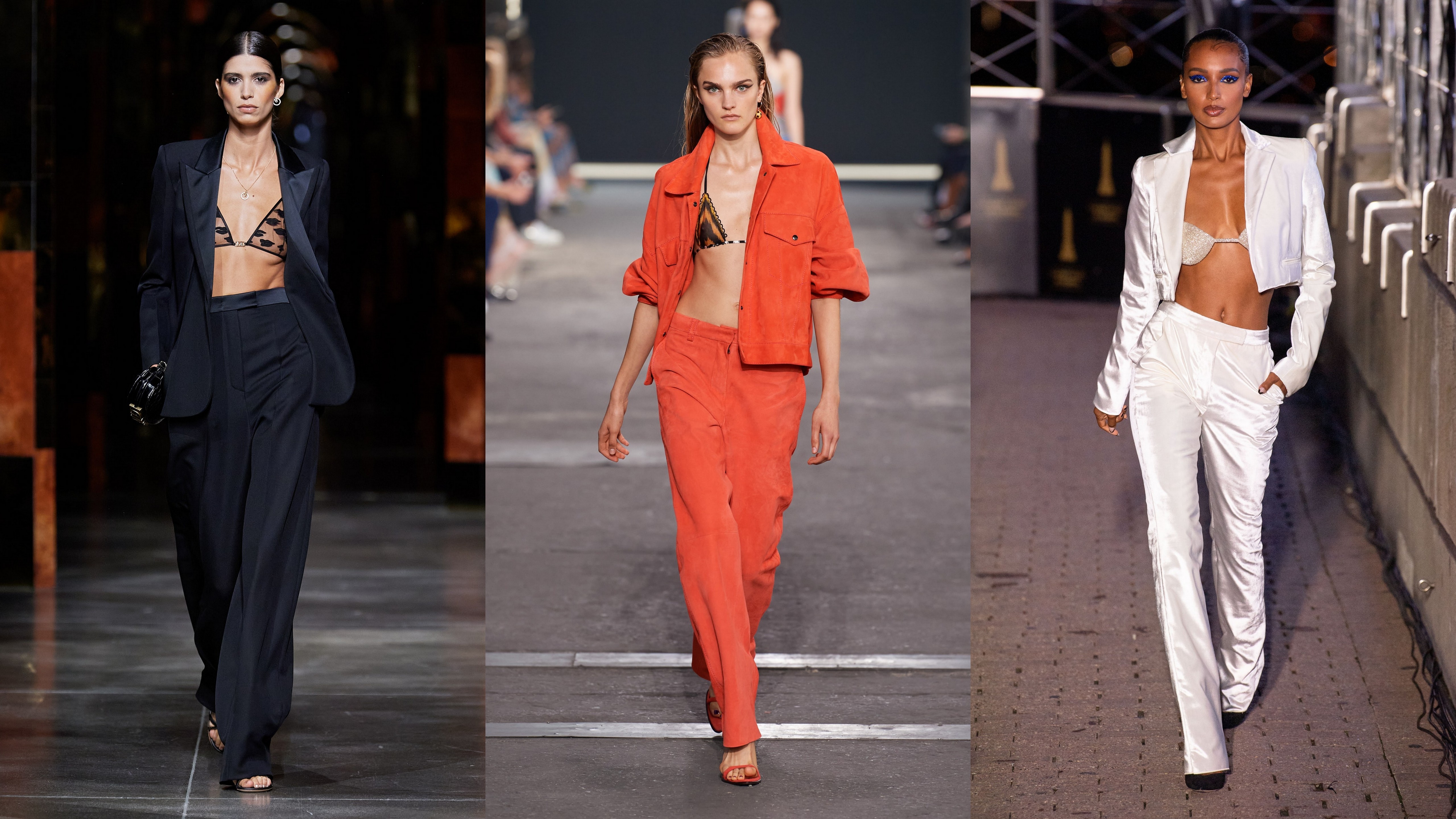 Costumul tradițional, piesa centrală a oricărei garderobe, nu face excepție de la această regulă și se poartă acum deschis peste sutien. Asta este ceea ce oferă Fendi în noua sa colecție compusă din look-uri monocrome care pune pe primul loc cea mai sexy piese vestimentare existentă. Același lucru s-a observat la Gauchere care combină jacheta cu o bandă neagră simplă.