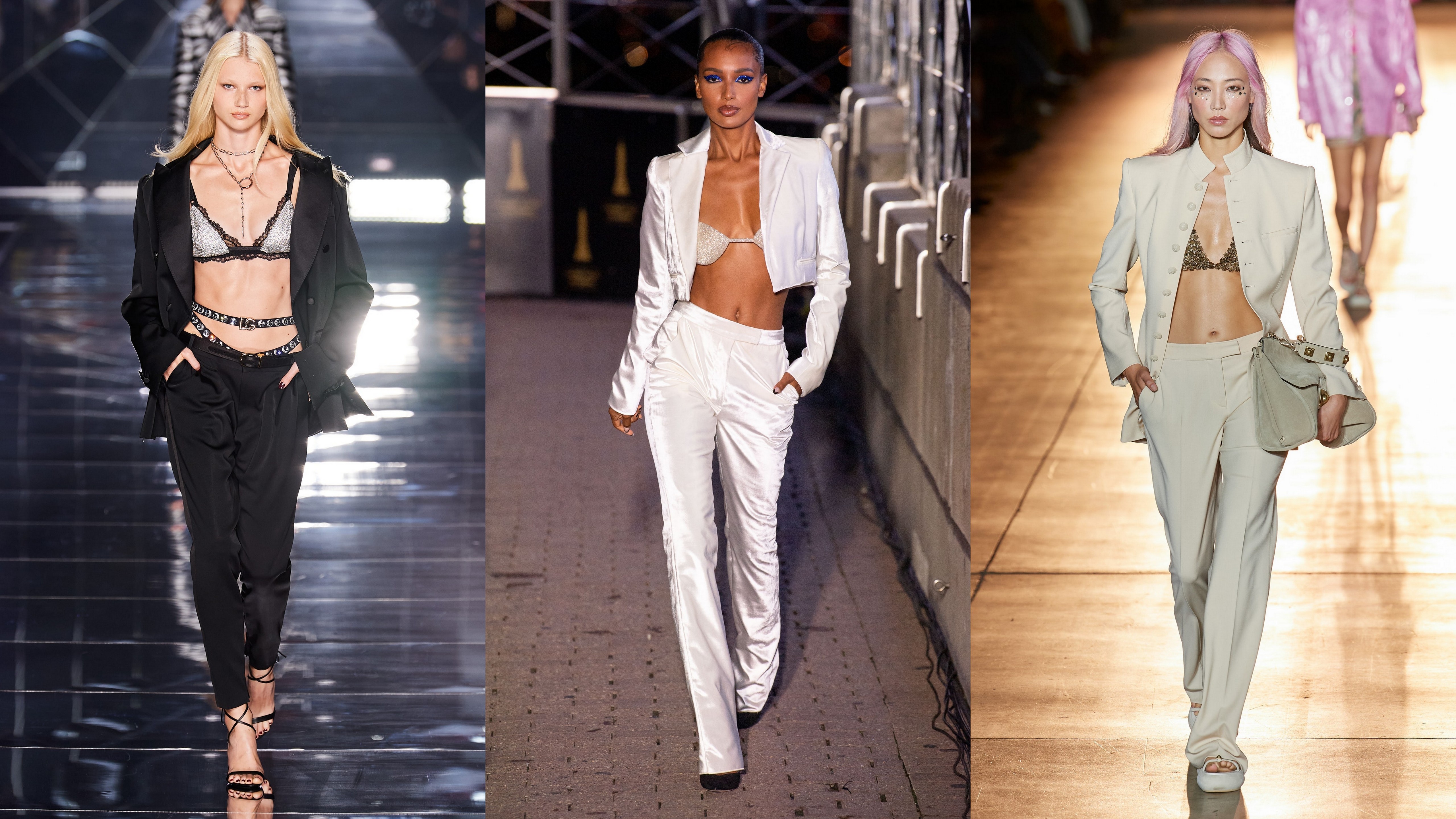 Unele case au ales să facă un combo un pic mai sofisticat. Aceasta este propunerea pe care o găsim, de exemplu, la Dolce & Gabbana, cu dantelă neagră și detalii metalice. În ceea ce privește costumul alb, acesta poate fi îmbunătățit cu un sutien cu paiete ca la LaQuan Smith, sau cu lanț ca la Etro. Aceste look-uri, deși sunt ușor de reprodus, cu siguranță nu sunt făcute pentru cele mai timide dintre femei.