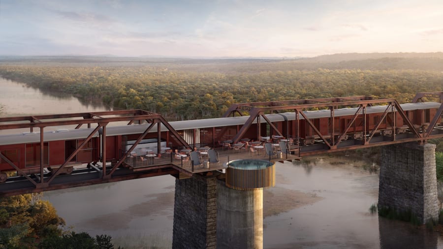 Hotelul, numit Kruger Shalati: The Train on the Bridge, este construit pe Podul Selati de peste Râul Sabie din Parcul Național Kruger.