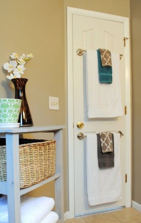 O soluție la îndemână pentru o baie mică este să folosești inclusiv ușa, pe care poți monta unul sau două suporturi pentru prosoape.
