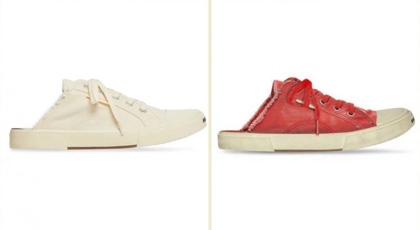 Pantoful cu toc lipsă vine în alb și negru, la fel ca majoritatea pantofilor sport din „cauciuc și pânză învechită”, s-a epuizat deja. La urma urmei, este Balenciaga și, dacă pot vinde cu succes genți inspirate din saci de gunoi pentru 1.790 de dolari, atunci adidașii Paris High distruși sunt de-a dreptul uimitori.