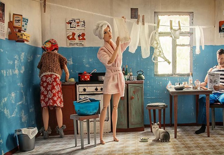 Barbie - îmbrăcată într-un halat de baie și părul învelit într-un prosop - este pozată agățându-și lenjeria pe o sârmă din mijlocul încăperii, în timp ce Ken citește ziarul Pravda (fostul ziar oficial al Partidului Comunist) la masă și o altă figură (poate mama lui Barbie ) se vede spălând vasele în fundal. Întreaga scenă este impresionant de credibilă - este chiar natural luminată din spatele ferestrei în miniatură.