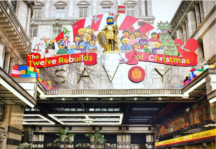 Până pe 3 ianuarie, oaspeții Savoy sunt tratați cu 12 instalații de vacanță compuse în întregime din piese LEGO. Fiecare reprezintă un vers din melodia clasică Twelve days of Christmas, reimaginate prin ochii unui copil. Așadar, pentru prima zi de Crăciun, LEGO a adus un brad de Crăciun în formă de dragon.